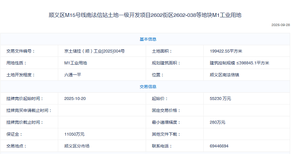 顺义区M15号线南法信站土地一级开发项目2602街区2602-038等地块M1工业用地是顺义区2025年供地重点项目。项目供地面积19.94公顷,具体四至范围为:东至信礼路、规划公园绿地;西至顺达路、规划地块边界及一级开发边界;南至信中街;北至物流园六街、义贤街、信中北街。
