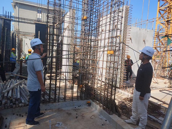 杨镇一中改扩建工程项目部的陈超、范占奎在岗值班值守,对施工现场安全隐患展开全覆盖排查,重点检查首层钢筋绑扎、预制构件出厂合格、现场安装等情况,高标准把控工程质量。